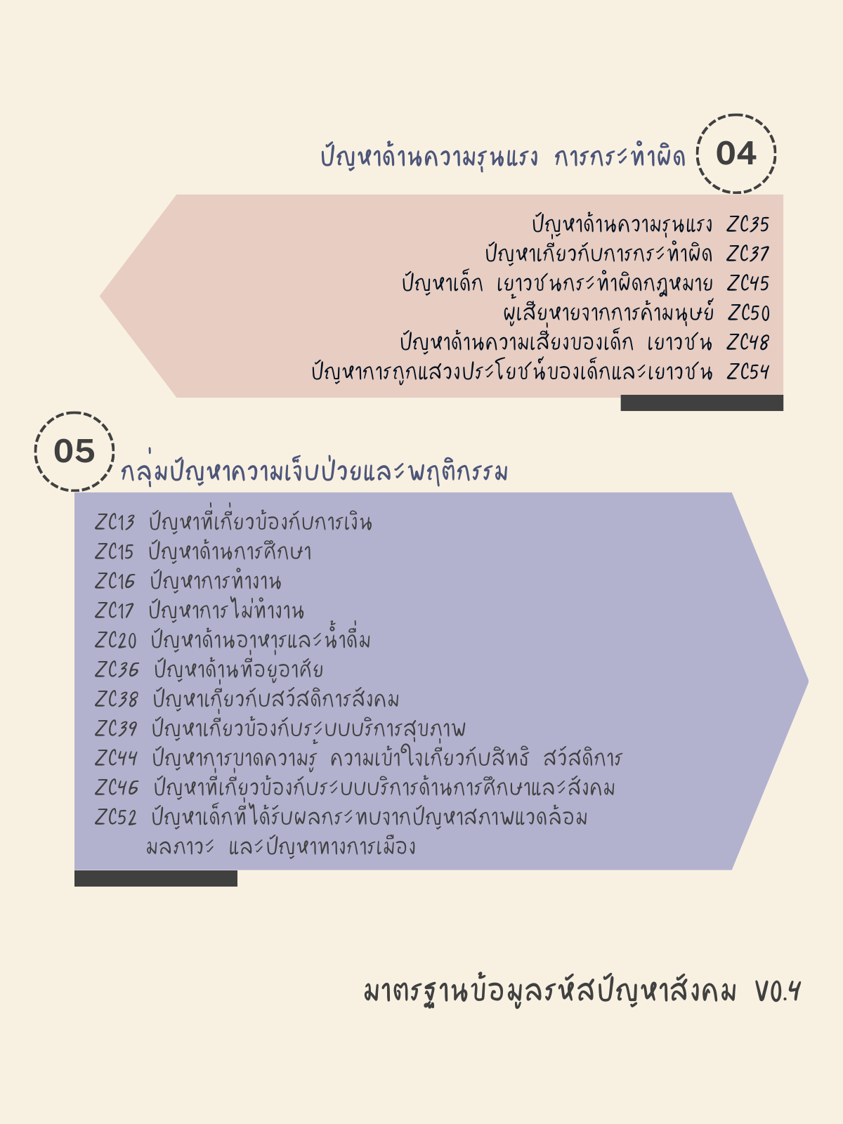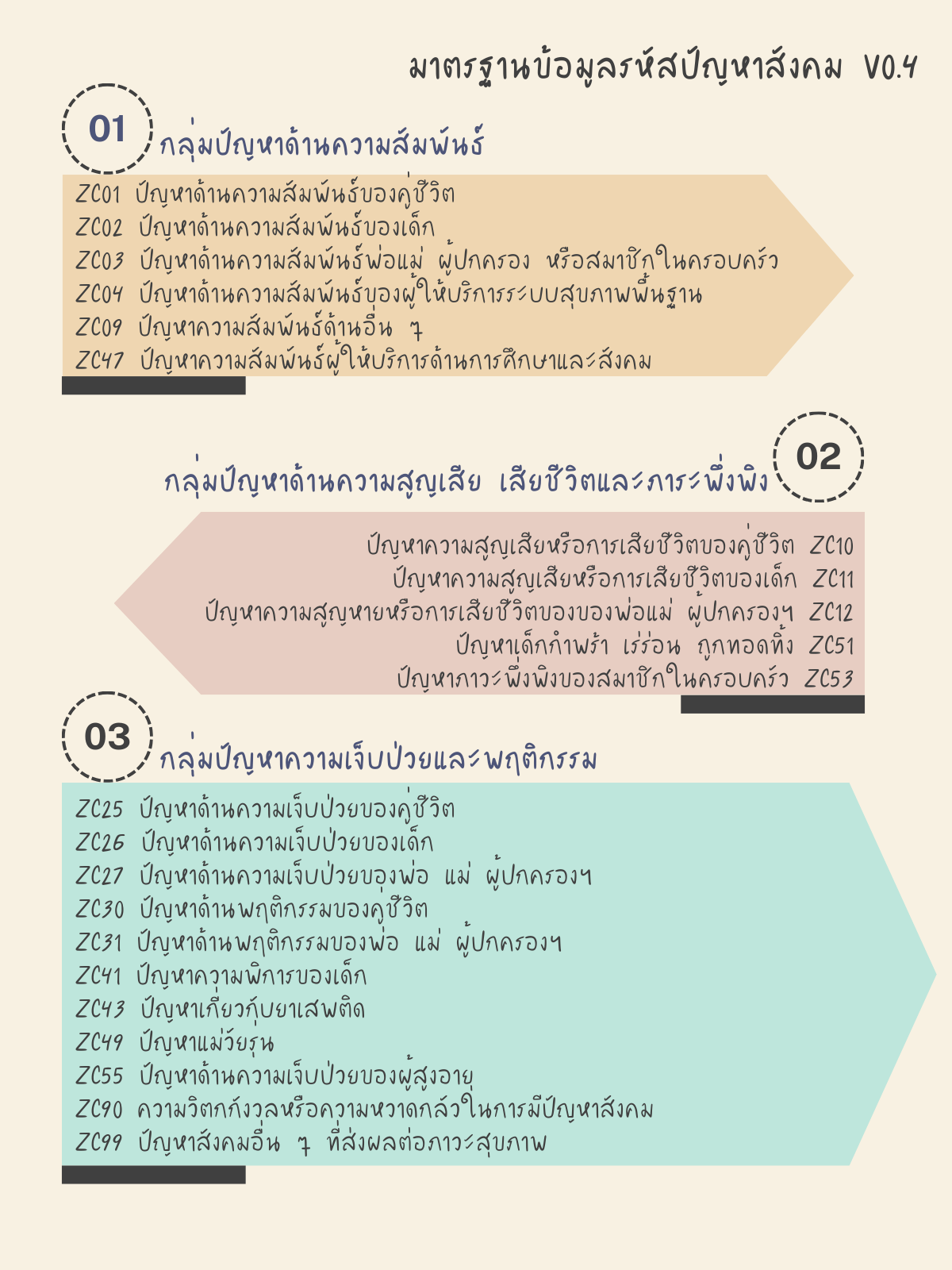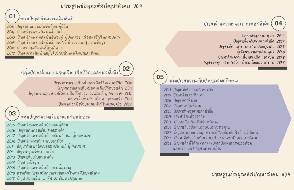 จากการพัฒนาอย่างต่อเนื่องของมาตรฐานรหัสข้อมูลปัญหาสังคมในประเทศไทย คู่มือรหัสปัญหาสังคม version 0.4 นี้จึงมีความครอบคลุมรายการปัญหาสังคมของประเทศไทย ประกอบด้วย 40 หมวดรายการหลัก 278 รายการปัญหาย่อย
